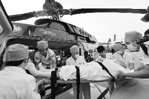 昨日早上5時整,999直升機(jī)從密云機(jī)場起飛;5時23分,急救直升機(jī)抵達(dá)999清河急救中心停機(jī)坪。5分鐘后,救護(hù)車載著老人抵達(dá)。“慢點(diǎn)!慢點(diǎn)!讓開車門,小心直升機(jī)尾翼!”一位渾身包著繃帶、戴著頸托的老人被抬出了救護(hù)車,老人緊閉雙眼,顯得十分虛弱。擔(dān)架上的老人被小心翼翼地移上直升機(jī)。旋即,直升機(jī)騰空而起,前往天津?yàn)I海國際機(jī)場。