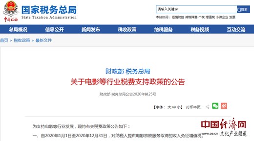 經(jīng)濟日報-中國經(jīng)濟網(wǎng)北京5月20日訊 近日,國家稅務總局官網(wǎng)發(fā)布《關(guān)于電影等行業(yè)稅費支持政策的公告》(以下簡稱《公告》),支持電影等行業(yè)發(fā)展。