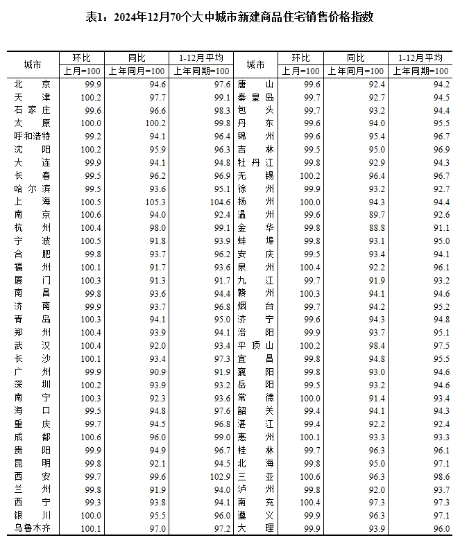 中國經(jīng)濟網(wǎng)北京1月17日(記者 李方) 17日,國家統(tǒng)計局發(fā)布2024年12月份70個大中城市商品住宅銷售價格變動情況統(tǒng)計數(shù)據(jù)。數(shù)據(jù)顯示,2024年12月份,70個大中城市中,一線城市商品住宅銷售價格環(huán)比上漲,二三線城市環(huán)比總體降幅收窄;一二三線城市同比降幅均繼續(xù)收窄。