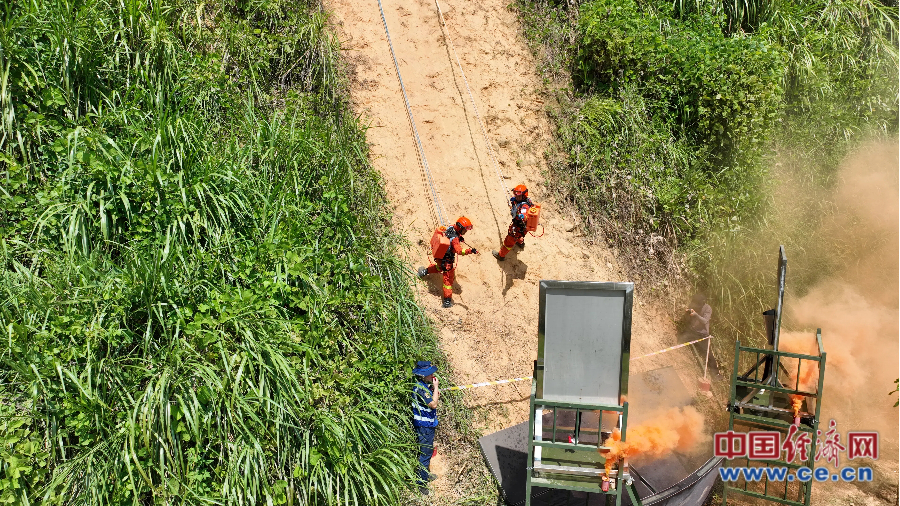 消防員在特殊地形處置煙點。特殊地形煙點處置是指在無法直接接近的陡坡設(shè)置模擬煙點(水袋),要求人員協(xié)同利用繩索技術(shù)安全抵近煙點進行處置,以輸水時間和組織的安全性綜合評定成績,檢驗特殊地形條件下滅火、救援技術(shù)結(jié)合運用的能力。 李為展/攝