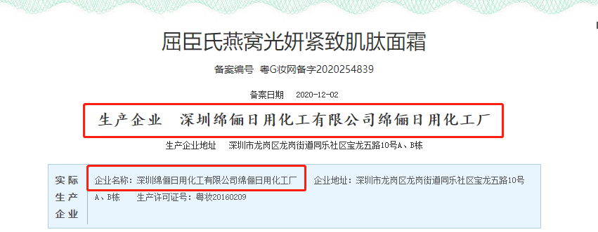 記者通過國產非特殊用途化妝品備案平臺查詢得知,深圳綿儷日用化工有限公司是屈臣氏燕窩光妍緊致肌肽精華液、歐薇蔻肌肽水光晶致面膜、護加宜精研臻護雙萃精華液等800多款產品的生產企業(yè)。