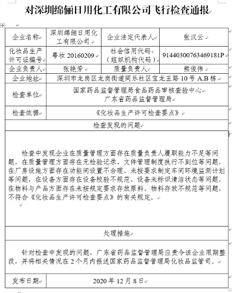 針對檢查中發(fā)現(xiàn)的問題,國家藥監(jiān)局要求廣東省藥品監(jiān)督管理局應責令深圳綿儷日用化工有限公司限期整改,并將相關情況在2個月內報送國家藥品監(jiān)督管理局化妝品監(jiān)管司。