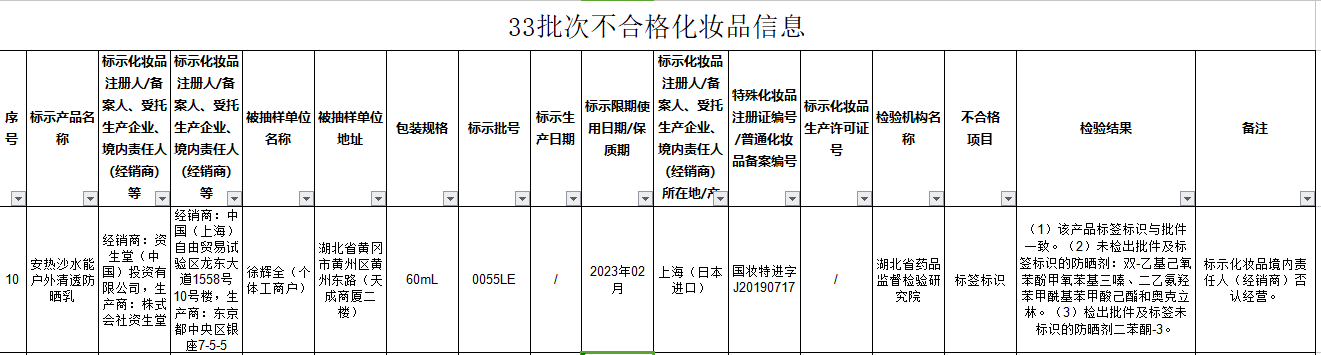 通告顯示,經(jīng)湖北省藥品監(jiān)督檢驗(yàn)研究院檢測(cè),經(jīng)銷商為資生堂(中國)投資有限公司,生產(chǎn)商為株式會(huì)社資生堂銷售的產(chǎn)品安熱沙水能戶外清透防曬乳產(chǎn)品不合格,檢驗(yàn)結(jié)果為未檢出批件及標(biāo)簽標(biāo)識(shí)的防曬劑:雙-乙基己氧苯酚甲氧苯基三嗪、二乙氨羥苯甲?;郊姿峒乎ズ蛫W克立林;檢出批件及標(biāo)簽未標(biāo)識(shí)的防曬劑二苯酮-3。