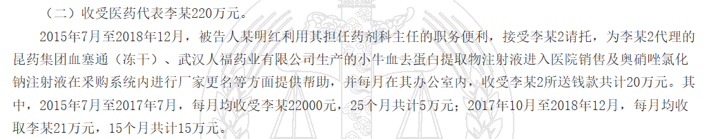 根據(jù)判決書,2015年7月至2018年12月,被告人某明紅利用其擔(dān)任藥劑科主任的職務(wù)便利,接受“李某2”請(qǐng)托,為“李某2”代理的昆藥集團(tuán)血塞通(凍干)、武漢人福藥業(yè)有限公司生產(chǎn)的小牛血去蛋白提取物注射液進(jìn)入醫(yī)院銷售及奧硝唑氯化鈉注射液在釆購系統(tǒng)內(nèi)進(jìn)行廠家更名等方面提供幫助,并每月在其辦公室內(nèi),收受“李某2”所送錢款共計(jì)20萬元。