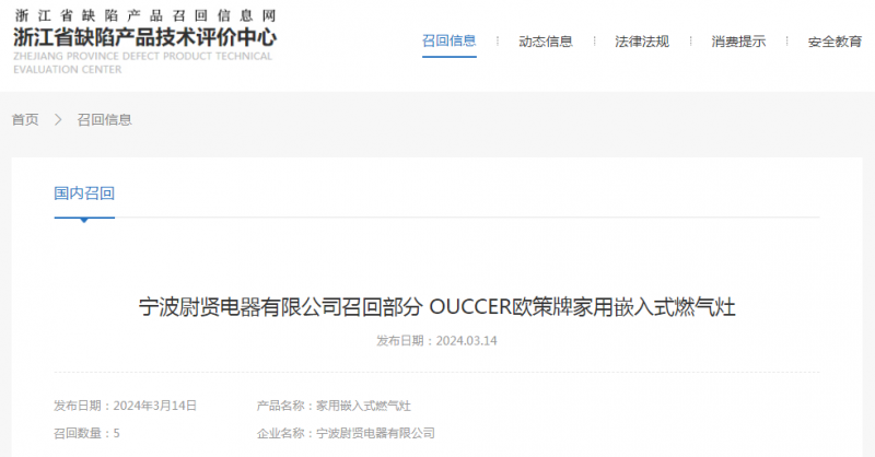 日前,寧波尉賢電器有限公司受缺陷調(diào)查影響按照《消費品召回管理暫行規(guī)定》的要求,主動向浙江省市場監(jiān)督管理局和寧波市市場監(jiān)督管理局報告了召回計劃,將自即日起,召回2023年3月1日期間制造的OUCCER歐策牌JZY-OC20型號家用嵌入式燃?xì)庠睿婕皵?shù)量為5件。