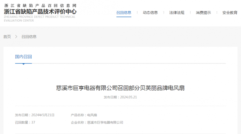 日前,慈溪市巨亨電器有限公司按照《消費品召回管理暫行規(guī)定》的要求,主動向浙江省市場監(jiān)督管理局和寧波市市場監(jiān)督管理局報告了召回計劃,將自即日起,召回2023年5月15日至2023年6月10日期間制造的部分貝芙麗牌B280型號電風扇,涉及數(shù)量為37臺。
