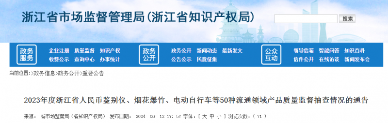 2024年6月12日,浙江省市場監(jiān)督管理局網(wǎng)站發(fā)布2023年度浙江省人民幣鑒別儀、煙花爆竹、按摩器具、電動自行車等50種流通領(lǐng)域產(chǎn)品質(zhì)量監(jiān)督抽查情況的通告。