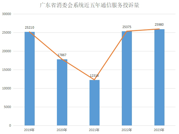 《報(bào)告》顯示,2019年至2023年,廣東省消委會(huì)系統(tǒng)共收到通信服務(wù)投訴106750件,占投訴總量的5.12%,呈現(xiàn)出先降后升的“V”字走勢(shì)。其中,前3年(2019年至2021年)相關(guān)投訴持續(xù)下降,從25210件降至12318件,平均降幅近三成。但隨著通信服務(wù)市場(chǎng)競(jìng)爭(zhēng)日趨激烈、業(yè)務(wù)更加多元,2022年起通信投訴再度飆升,投訴量達(dá)25375件,同比上升106.00%,而2023年維持高位(25980件)。
