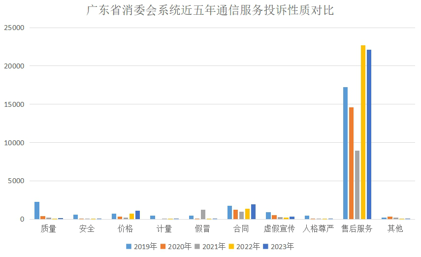 從投訴類(lèi)別來(lái)看,近5年通信服務(wù)投訴95%以上集中在移動(dòng)電話(huà)服務(wù),與當(dāng)前通信業(yè)發(fā)展現(xiàn)狀相符(2023年廣東固話(huà)、移動(dòng)電話(huà)用戶(hù)數(shù)比例約為1:10)。從投訴性質(zhì)來(lái)看,消費(fèi)者反映的問(wèn)題主要集中在售后服務(wù)、合同和價(jià)格3類(lèi),其中售后服務(wù)問(wèn)題最為集中,占投訴總量的80.19%,是通信服務(wù)類(lèi)投訴增長(zhǎng)變化的主要因素。從地區(qū)分布來(lái)看,通信服務(wù)投訴集中在消費(fèi)活躍的珠三角地區(qū),主要與經(jīng)濟(jì)發(fā)展?fàn)顩r、人員密集程度相關(guān)。