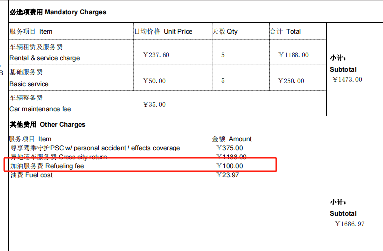 后來,趙女士仔細查看神州租車的賬單,發(fā)現(xiàn)自己竟額外支付了123.97元。其中,23.97元為油費,100元是此前從未見過的“加油服務費”,趙女士立即聯(lián)系線上客服詢問。