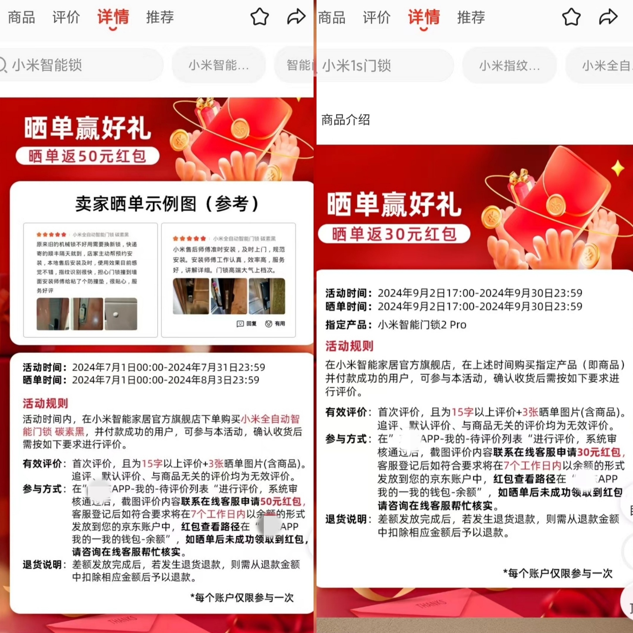 中國消費者報北京訊(記者杜科)小米智能家居官方旗艦店在商品頁面宣稱“曬單返50元紅包”,且商家給出的曬單示例圖全是五星好評,消費者認(rèn)為該活動涉嫌誘導(dǎo)用戶“好評返現(xiàn)”(詳見《中國消費者報》7月30日1版《“好評返現(xiàn)”披上新外衣! 涉及小米、松下等品牌 法律人士:加強監(jiān)督管理 劍指不正當(dāng)競爭》)。報道刊發(fā)后引發(fā)社會廣泛關(guān)注。近日,記者再次調(diào)查了報道中涉及的相關(guān)網(wǎng)店和商品,發(fā)現(xiàn)其均已做了調(diào)整。