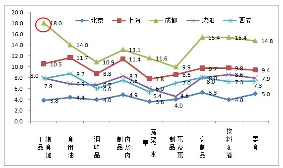雖然成都、上海對食品安全過去一年的改善情況,現(xiàn)狀及未來發(fā)展趨勢都不是很樂觀,但是這兩個(gè)城市的安全信心指數(shù)增長情況卻是最快的。尤其是成都,其糧食加工品的安全信心指數(shù)增長高達(dá)18個(gè)點(diǎn)。